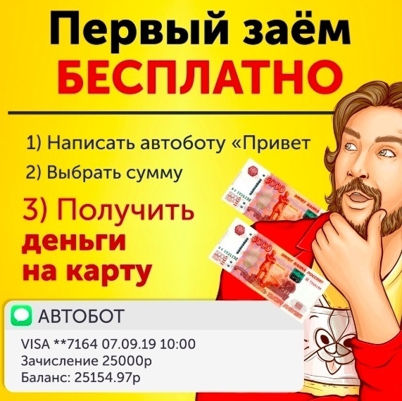 ПОЛУЧИ от 1.000 до 100.000 ? 0% на первый заем. Авто-выдача на карту Без справок и лишних проверок.Напиши ОдобреноБОТу "Привет" vk.me/izaimobotsПодожди ответ 2-4 минуты и получи свои деньги!